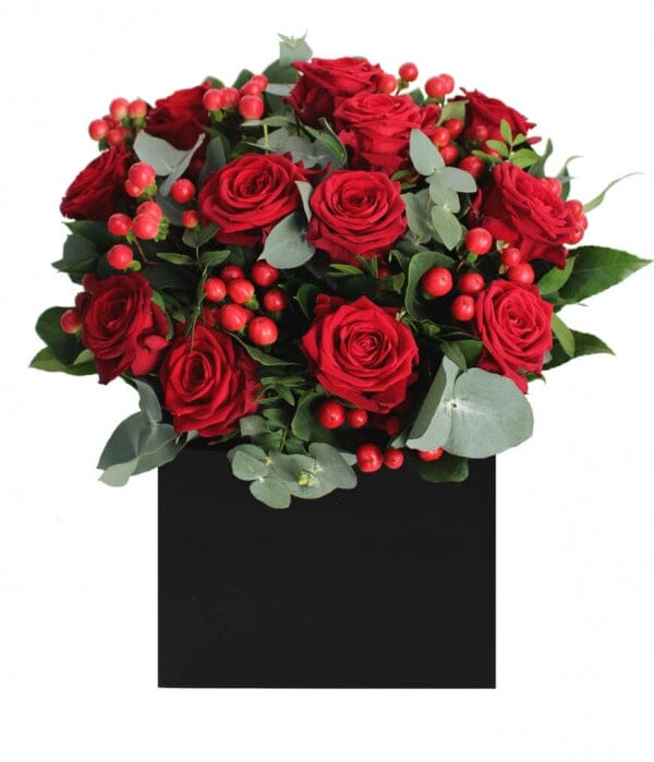 The passionate red roses symbolize love and devotion, while the hypericum berries add a touch of unique texture and depth. The eucalyptus enhances the arrangement with its fresh fragrance and lush greenery, creating a harmonious and balanced design.