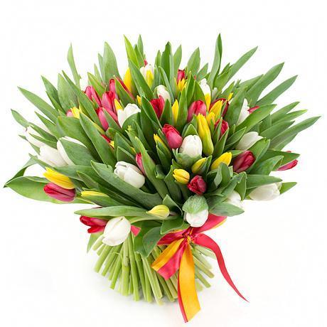 The Red, White, and Yellow Tulips Bouquet is a stunning arrangement that celebrates the vibrant colors of spring with its combination of red, white, and yellow tulips, accented with lush greenery.