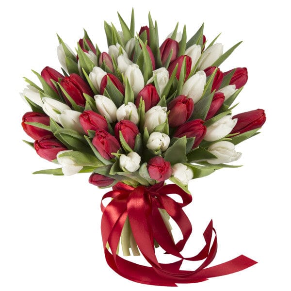 Each tulip in this bouquet is carefully selected for its vibrant color and delicate beauty, representing purity, love, and admiration. The rich red tulips symbolize passion and romance, while the pristine white tulips convey purity and serenity, making this bouquet a perfect expression of heartfelt emotions.