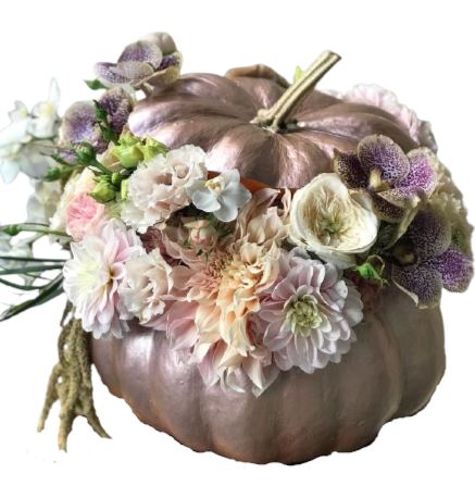 The Rose Gold Pumpkin Arrangement is a stunning and unique floral display that beautifully combines the elegance of soft blooms with the modern flair of a rose gold-painted pumpkin. This arrangement is perfect for autumn celebrations, festive gatherings, or as a distinctive centerpiece that adds charm and sophistication to any setting. The Rose Gold Pumpkin Arrangement is a stunning fusion of soft floral elegance and contemporary design.
