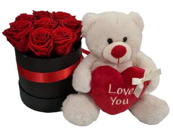 Celebrate love and affection with the Roses Box with "I Love You" Teddy Bear Gift Set. Its combination of beautiful roses and a cuddly teddy bear makes for a sweet and unforgettable gesture, ideal for making your loved one feel special on any occasion.