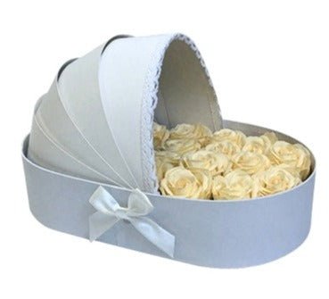 The idea with flowers in the cradle is amazing - so be the first to surprise! The cradle-shaped box is a perfect gift for a baby and its parents. Also a great idea as a baby shower gift, gift for mom or a great maternity gift.