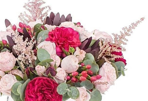 The Rosiness Garden Box is a stunning floral arrangement that captures the essence of romance, beauty, and elegance. Featuring a delicate blend of light pink pray roses, cerise garden spray roses, red hypericum, red leucodendron, and pink astilbe, this box is a harmonious mix of soft pastels and bold red hues, creating a truly enchanting floral display.