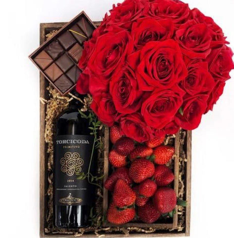 Each element of this luxurious gift is designed to create a memorable and sensory experience. The rich fragrance of fresh roses complements the sweet, creamy indulgence of the chocolate box, while the juicy, fresh strawberries enhance the overall sensation of freshness and sweetness. Paired with your choice of a fine bottle of wine, this gift is the perfect way to express love, affection, and appreciation.