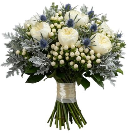 Elevate any occasion with the timeless beauty of our Silver Mist and Garden Roses Luxury Bouquet. This stunning hand-tied arrangement features delicate white garden roses, soft white hypericum berries, and velvety silver stachys leaves, perfectly balanced with lush greenery for a natural, sophisticated finish.