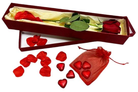 Express your love with the Single Rose Luxury Box , featuring a beautiful rose paired with a cute bag of chocolate hearts and rose petals, exclusively from Flowers Box London.