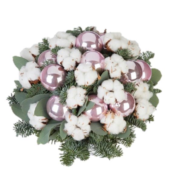 A bouquet of baubles and cotton wool is kept in the atmosphere of Christmas. The bouquet is made of live spruce!