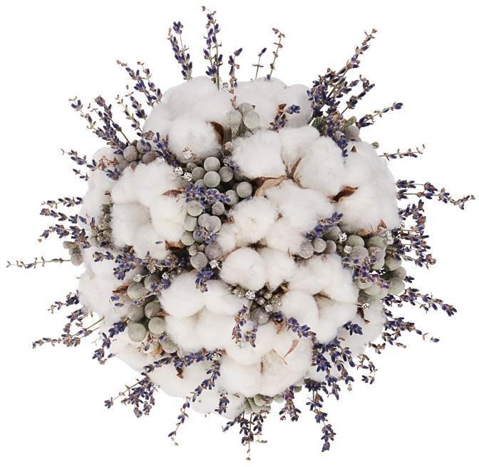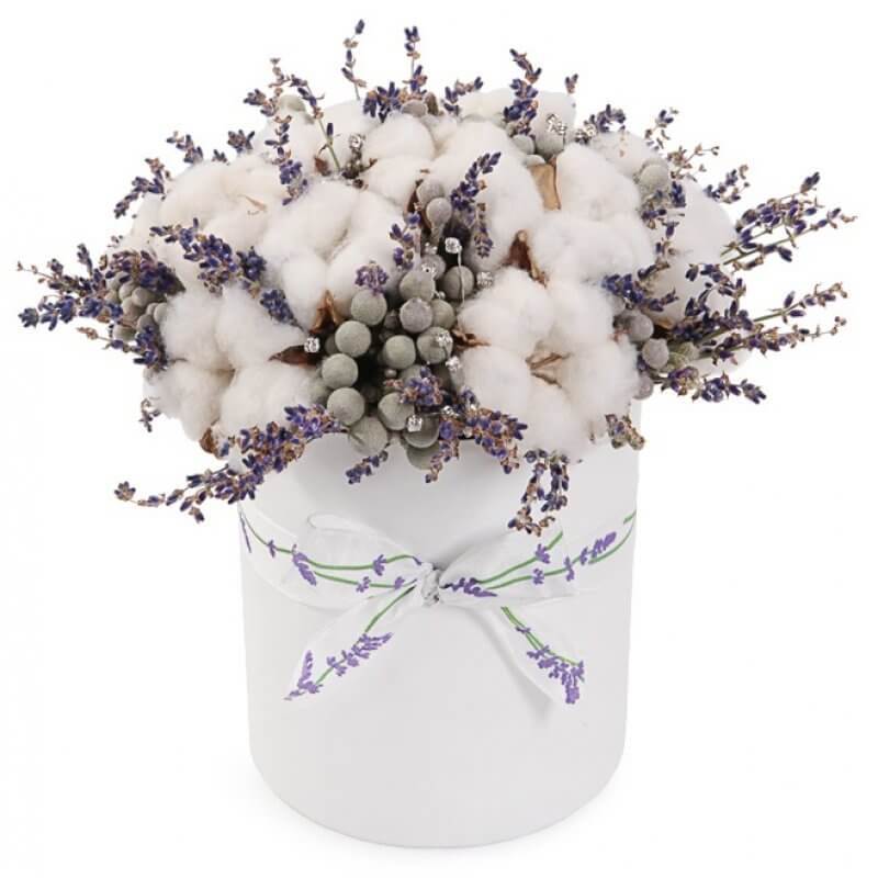 Stunning composition of white cotton, silver brummia and lavender in a box. Unique way to send flowers by post.