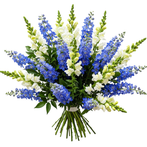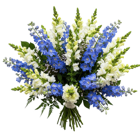 The blue delphinium brings a sense of calm and sophistication, while the snapdragons add a playful yet refined element, available in a range of hues to suit your taste or the occasion. This bouquet makes an ideal gift for someone who appreciates bold yet tasteful floral designs. Expertly arranged to highlight the natural beauty of each bloom, this bouquet is sure to leave a lasting impression.