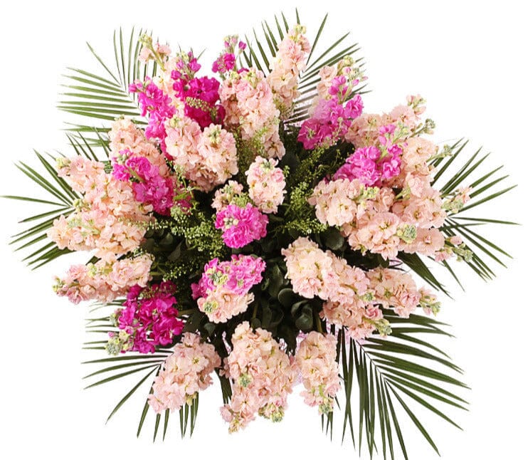 Brighten any space with the Splendit Bouquet of Peach and Pink Stock, a charming arrangement that combines soft peach stock, delicate pink stocks, fresh green bell accents, and lush palm leaves. This elegant bouquet offers a balanced mix of gentle colors and greenery, perfect for adding warmth and sophistication to any room.