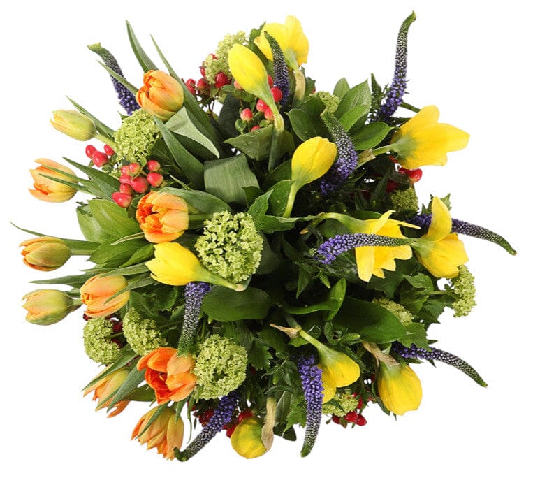- Blue Veronica: the elegant spires of Veronica provide soft structure and a gentle cool-toned contrast to the warm yellows and oranges. Blue flowers symbolize peace, calm, and serenity — a perfect balance in this lively bouquet.