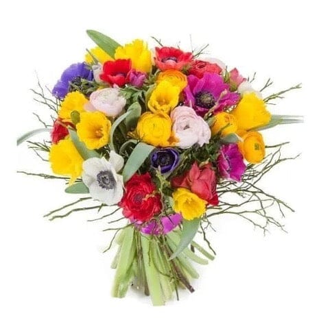 Welcome the season of renewal with our Springtime Colorful Bouquet, a cheerful and vibrant floral arrangement featuring a lively mix of anemones, daffodils, and ranunculus blooms in a rainbow of spring hues. Designed to bring brightness and energy into any space, this bouquet is the perfect gift to celebrate the beauty of spring.