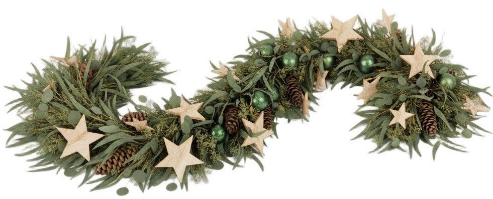 Stars and Green Baubles Eucalyptus Garland – Elegant Natural Christmas Decoration