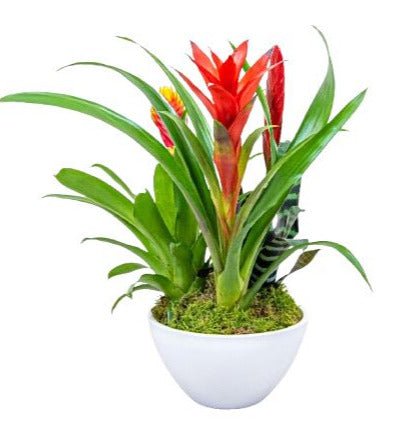 Combines the beauty of tropical plants with a sophisticated ceramic pot, suitable for any decor style. Bromeliads are known for their durability, offering long-lasting beauty with proper care. Add a tropical touch to your decor with the Stunning Bromeliads Arrangement in a chic pot. Ideal for home or office, this vibrant plant arrangement makes a thoughtful gift or a striking centerpiece.