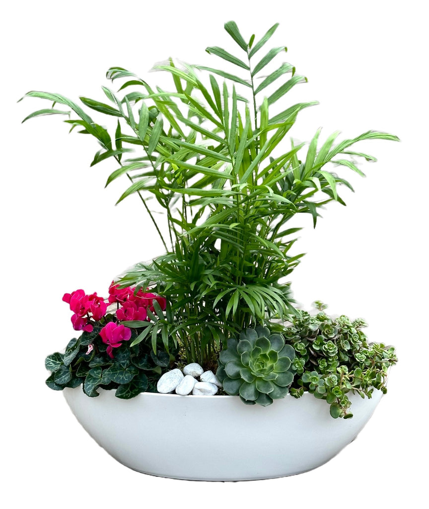 Transform your living space with our beautifully curated indoor plant arrangement, featuring a striking blend of chamaedorea (parlor palm), cyclamen, and a selection of cucculents. Each plant is carefully selected for its unique beauty and arranged in a stylish pot to bring life and elegance to your home. This combination of plants is ideal for anyone seeking a mix of vibrant colors, unique textures, and low-maintenance plants. Whether it’s for your own home or as a thoughtful gift, these plants will bring joy and life to any space.
