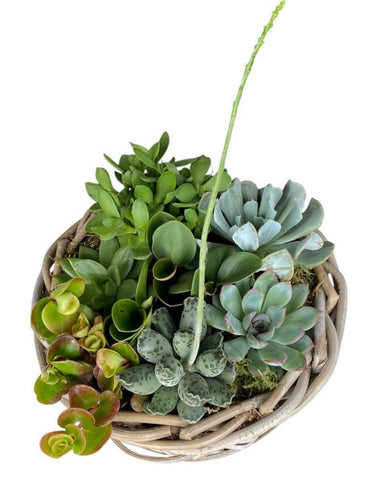- Woven Basket: the succulents are beautifully nestled in a natural round wicker basket, offering a rustic, earthy appeal. The basket not only complements the natural tones of the plants but also adds a warm, handmade touch to the overall presentation.