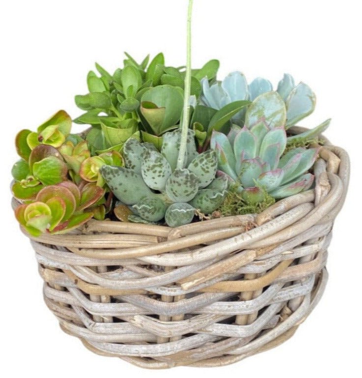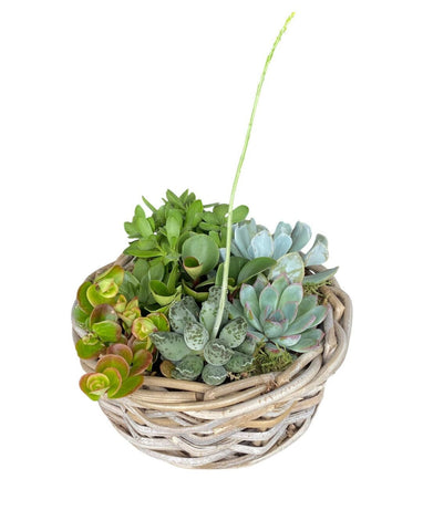 Introducing the Succulent Arrangement in Round Wicker Basket, a charming and contemporary piece of living decor that brings a touch of nature and elegance into any space.
