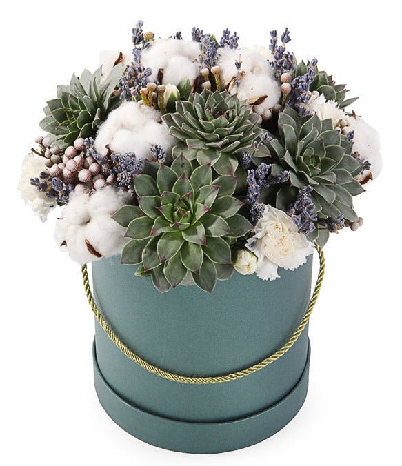 - Cotton: adds a snowy, wintry touch to this arrangement. Symbolizing warmth, comfort, and purity, it creates a beautiful seasonal contrast against the rich textures of the succulents.