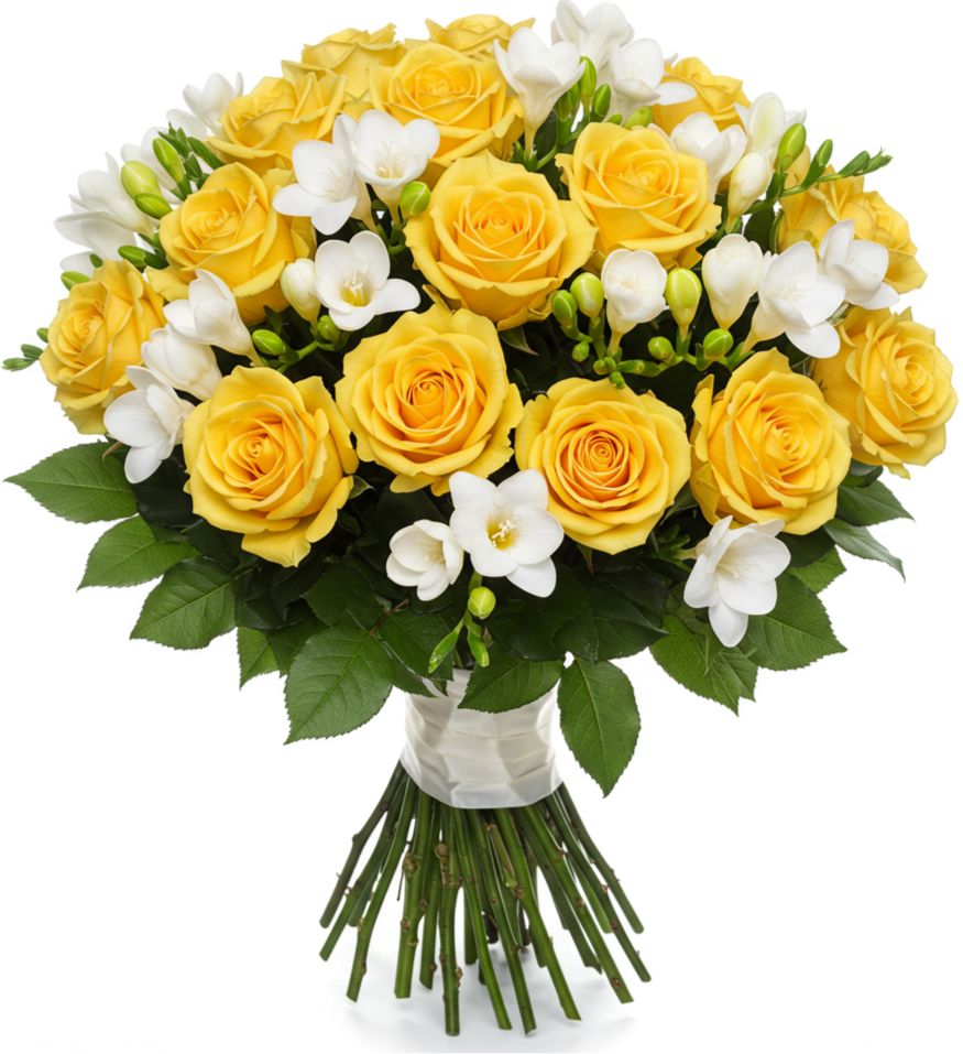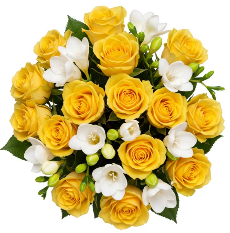 - White Freesias: add elegance and purity to the bouquet. Their creamy white petals perfectly complement the vibrant yellow roses, creating a balanced and harmonious look that’s both fresh and sophisticated.