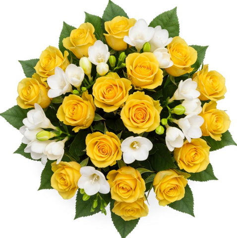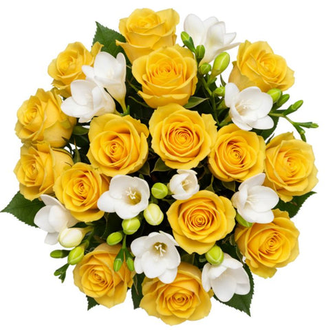 The radiant yellow roses symbolize joy and friendship, while the white freesias add a delicate, sweet fragrance. Paired with fresh greenery, this bouquet creates a lively and sophisticated look that’s ideal for summer gatherings, special events, or simply bringing a touch of nature into your home.