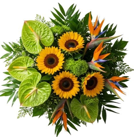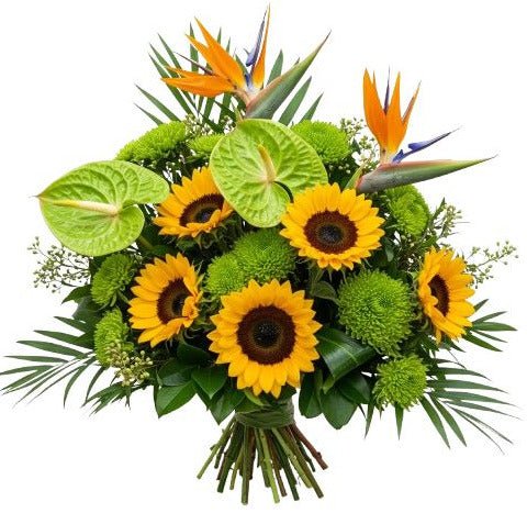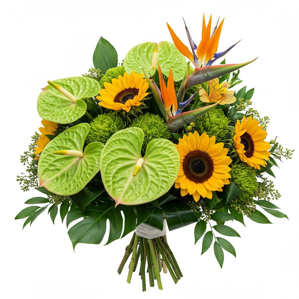 The arrangement features majestic Birds of Paradise, with their fiery orange and blue petals symbolizing freedom, joy, and paradise itself. These exotic flowers are paired with golden yellow sunflowers, whose cheerful, open faces bring warmth, happiness, and positivity to the bouquet. Adding a touch of sophistication, the bouquet includes elegant green anthuriums, known for their glossy heart-shaped petals and modern appeal. To create balance and depth, green chrysanthemums and green carnations are incorporated, adding freshness, texture, and a rich harmony of tones. Accents of fresh greenery complete the bouquet, giving it a full-bodied, vibrant look while enhancing the natural beauty of each bloom.