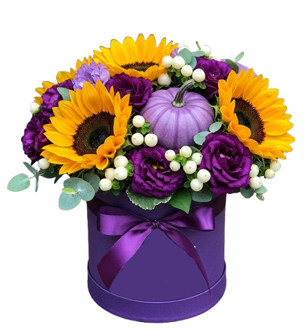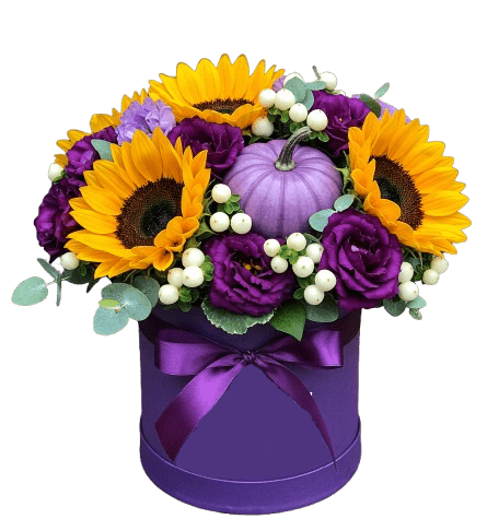The Sunflowers in Purple Halloween Box is a captivating mix of autumn warmth and Halloween enchantment. The bright sunflowers radiate energy and joy, the purple lisianthus and painted pumpkin introduce an elegant, mysterious tone, and the white snowberry and aromatic eucalyptus provide balance and texture. Perfect for festive décor, seasonal gifts, or Halloween celebrations, this arrangement blends elegance with playfulness — a modern, vibrant interpretation of autumn magic.