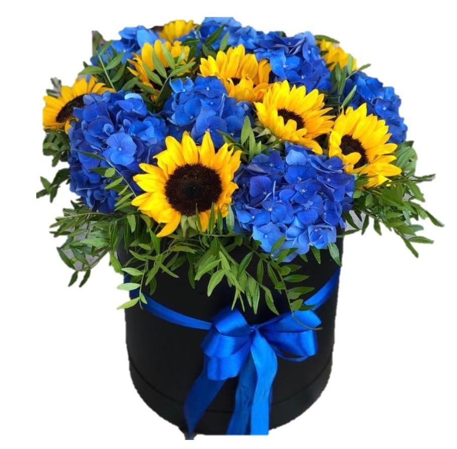 Make a bold and heartfelt statement with our Sunflowers with Hydrangea Box, a radiant floral arrangement that combines the warmth of golden sunflowers with the elegance of blue hydrangea blooms. Thoughtfully accented with fresh pistacia greenery, this exquisite box is the perfect way to express your most sincere emotions, whether it's love, appreciation, or celebration.