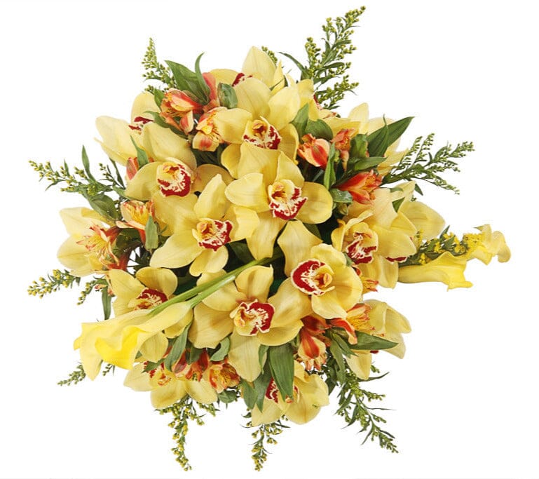 Brighten any day with the uplifting charm of our Sunny Bouquet with Cymbidium Orchids and Orange Alstroemeria. Designed to radiate warmth and happiness, this vibrant bouquet features a glowing mix of yellow calla lilies, yellow cymbidium orchids, orange alstroemeria, yellow solidago, and fresh greenery for a lush, cheerful finish. Whether you’re celebrating a birthday, sending get-well wishes, or simply bringing a touch of sunshine to someone’s space, this bouquet is a stunning way to express joy and positive energy.