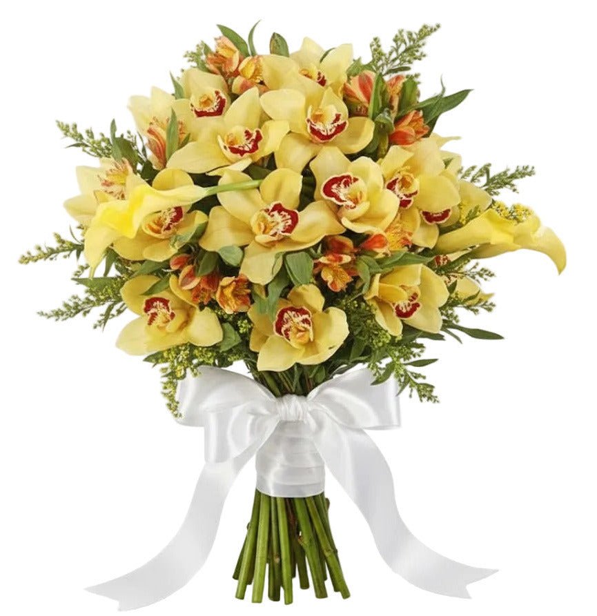 Sunny Bouquet with Cymbidium Orchids and Orange Alstroemeria – A Radiant Burst of Yellow and Orange Blooms