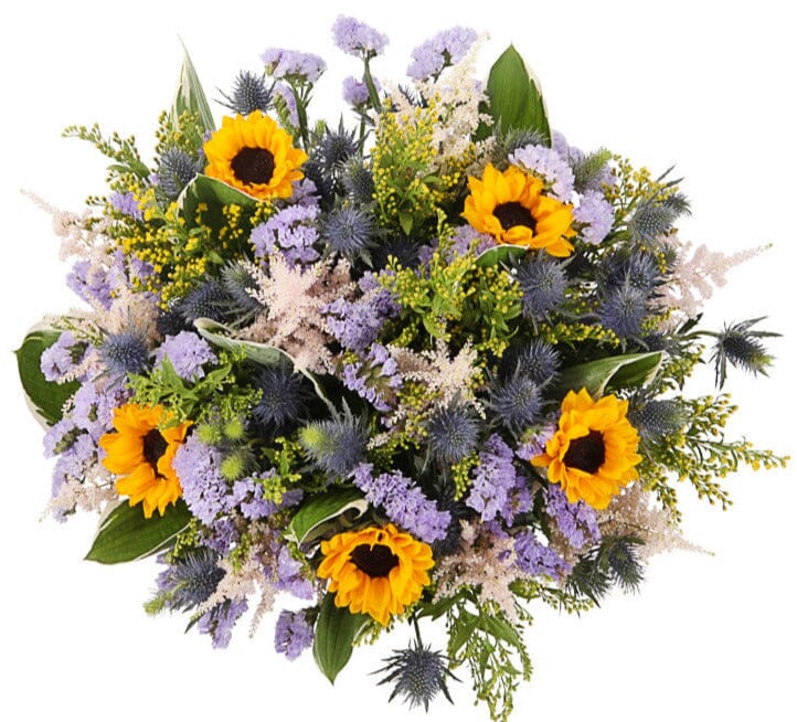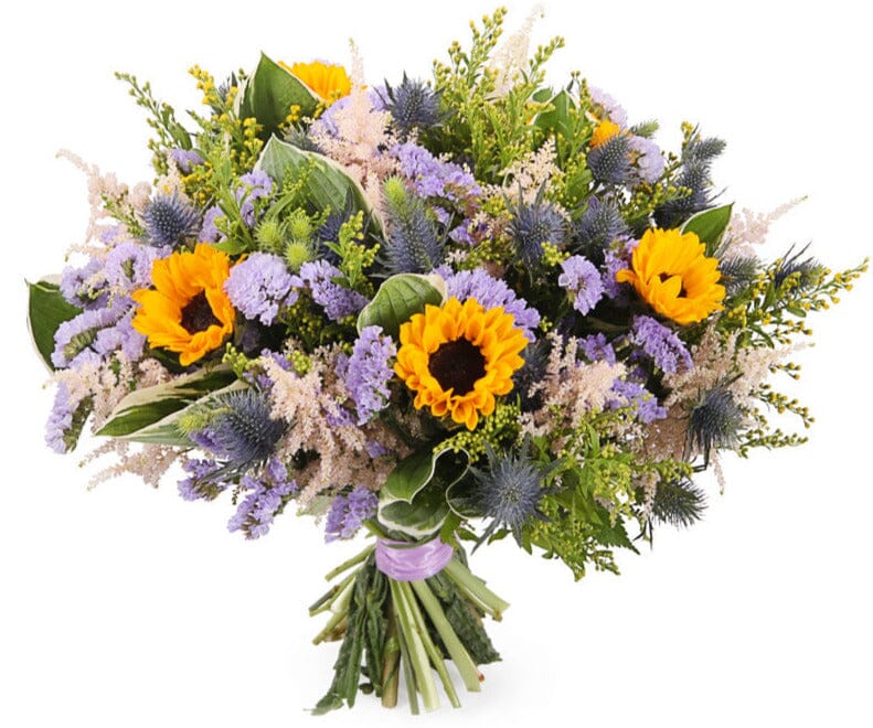 - Yellow Solidago: also known as goldenrod, yellow solidago fills out the arrangement with delicate clusters of small, bright flowers. It brings lightness and ties together the sunflower’s vibrant color palette.
