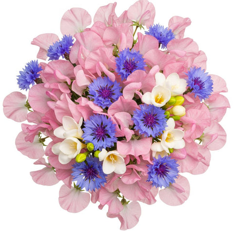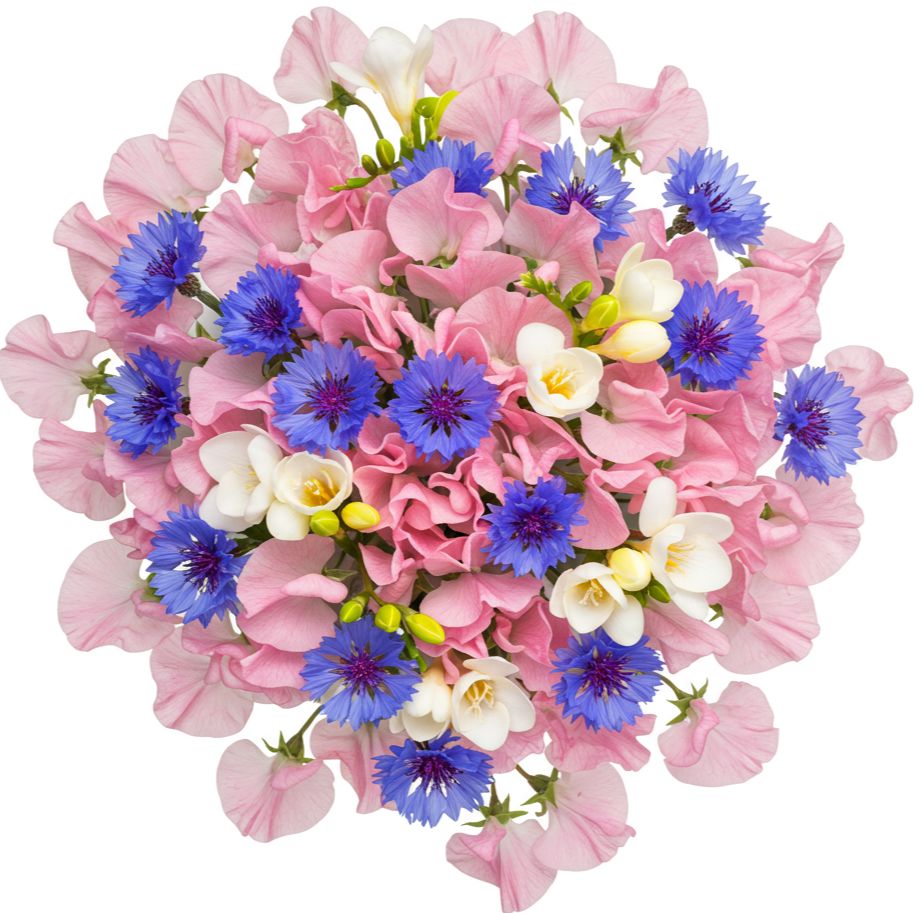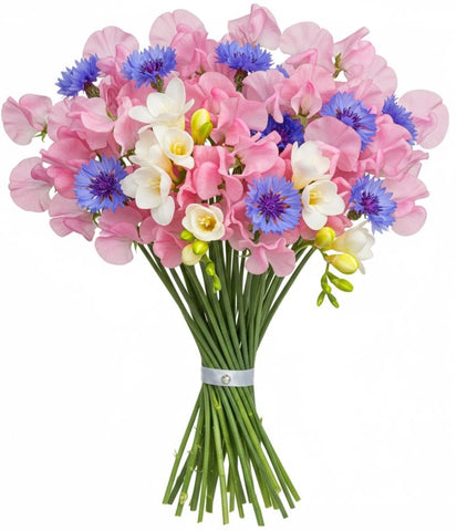 Delight in the charm and fragrance of our Sweet Pea and Freesias Bouquet with Blue Cornflowers, a vibrant and elegant floral arrangement that captures the essence of natural beauty. Handcrafted with care, this bouquet combines the soft delicacy of sweet peas (in your choice of colour), the elegance of white freesias, and the striking vibrancy of blue cornflowers blooms, creating a truly memorable gift for any occasion. These blooms create a harmonious design that is both eye-catching and full of sentiment.