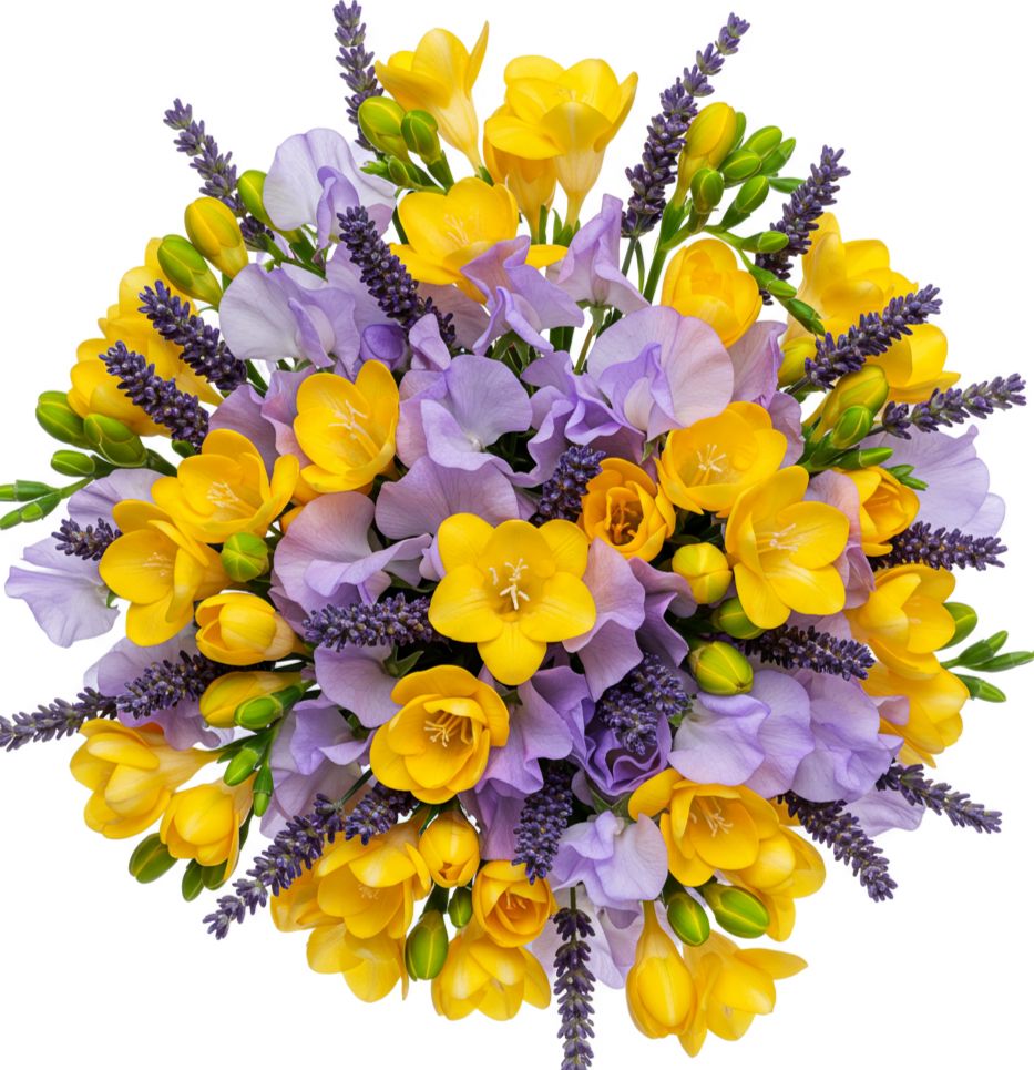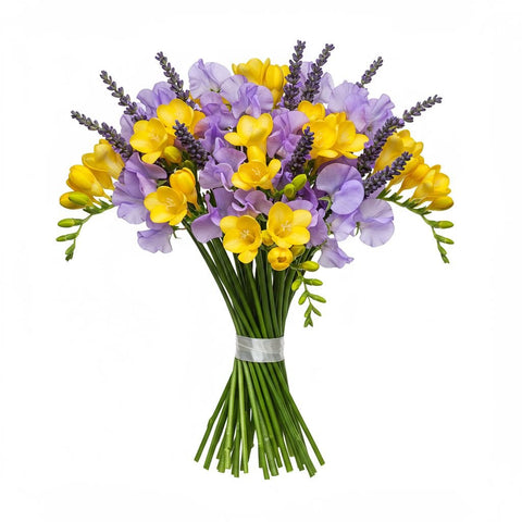Delight the senses with our Sweet Pea, Freesia, and Lavender Bouquet – a stunning combination of vibrant colors and heavenly fragrance. This hand-tied bouquet brings together the delicate beauty of sweet peas (with your choice of color), the bright cheer of yellow freesias, and the calming aroma of lavender for a truly memorable floral arrangement. Together, these flowers create a bouquet that is both visually striking and wonderfully aromatic blooms.