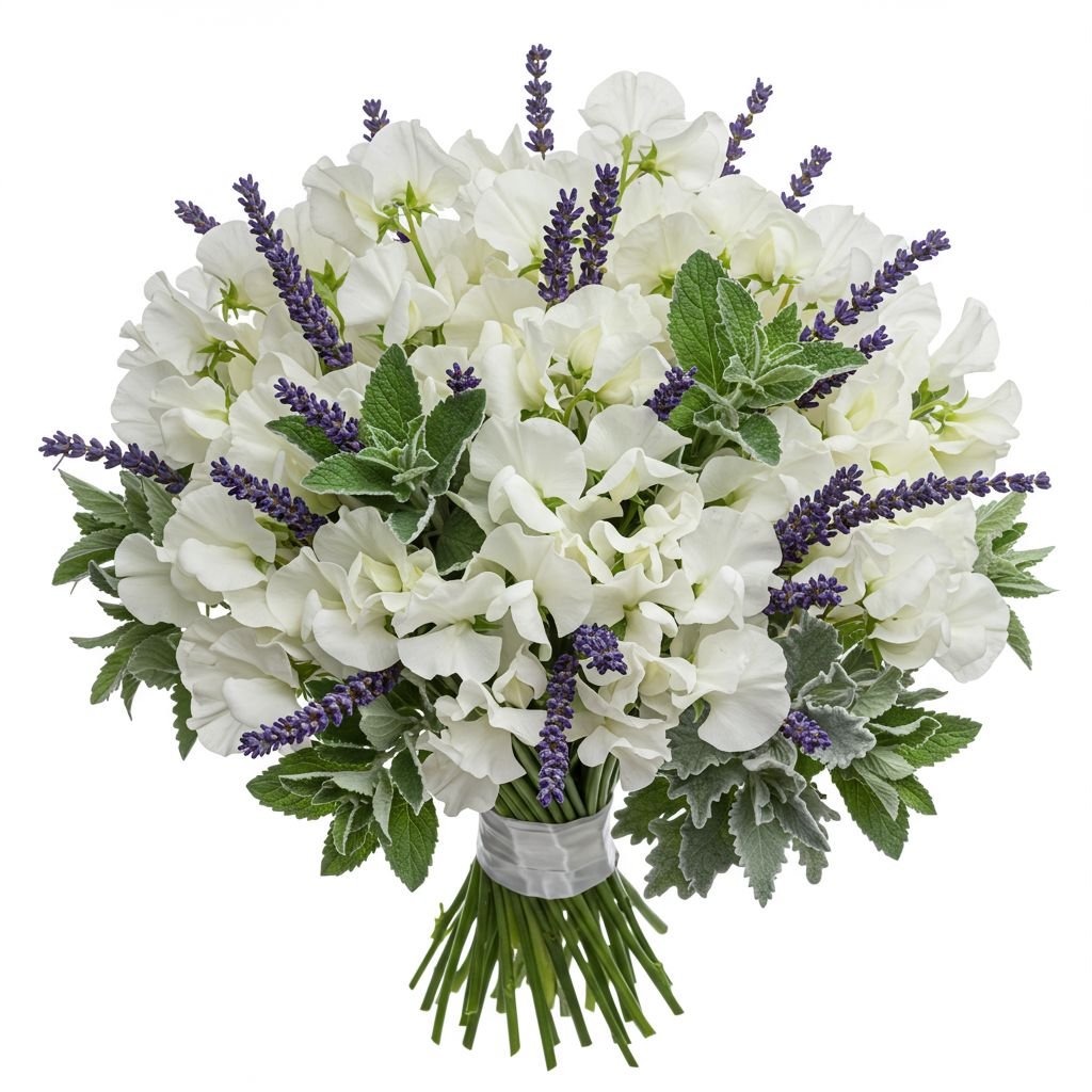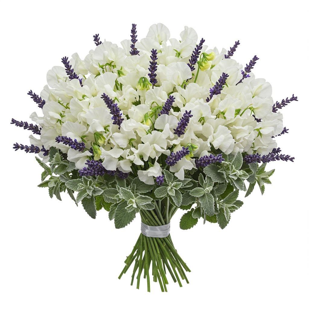 - Greenery: such as eucalyptus leaves, ferns, or salal foliage is incorporated to add texture and volume to the bouquet. The lush greenery provides a beautiful backdrop for the sweet pea and lavender blooms, enhancing their natural beauty and fragrance.
