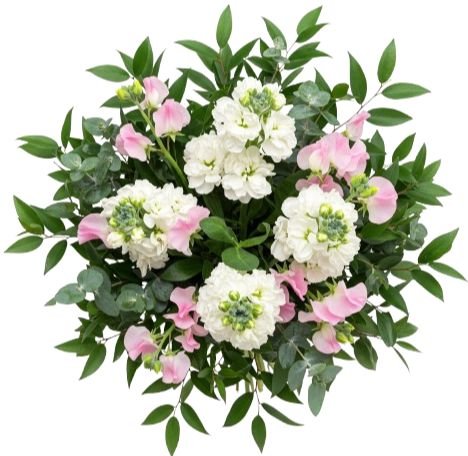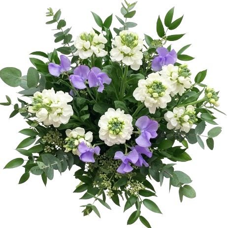 Delight your senses with our elegant Sweet Pea with White Stocks Scented Bouquet, expertly arranged to bring fresh fragrance and beauty into any space. This bouquet combines the delicate scent of white stocks with vibrant sweet peas in the color of your choice, complemented by lush greenery for a natural, full look.