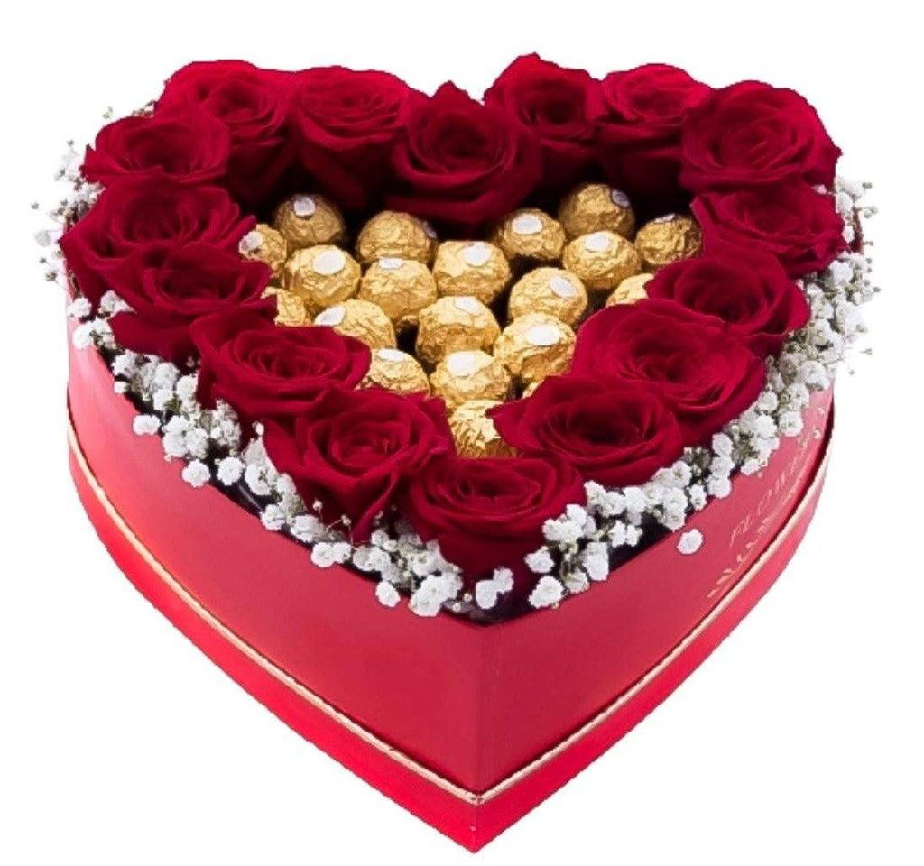 Sweet Romance Heart Box – Red Roses, White Gypsophila & Ferrero Chocolate