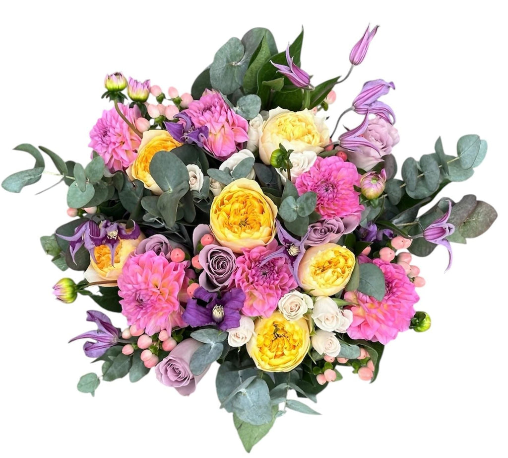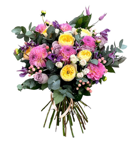 This bouquet features a cheerful mix of yellow garden roses, romantic pink dahlias, regal purple clematis, calming lavender roses, sweet peach spray roses, and unique snowberries, all complemented by lush eucalyptus foliage. Each flower has been carefully selected to create a harmonious blend of colors and textures, making this bouquet a true celebration of nature's beauty.