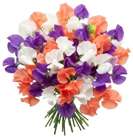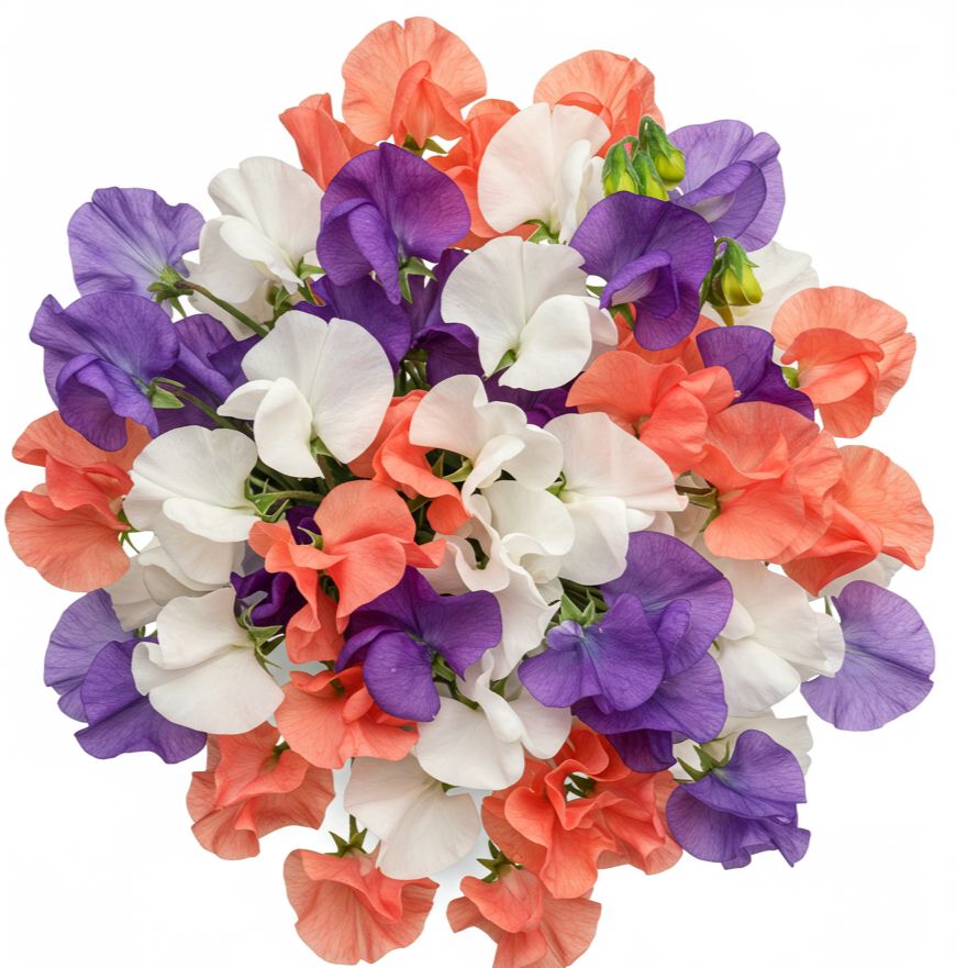 - Coral Sweet Pea: radiant and warm, the coral sweet pea brings a touch of cheerfulness to the arrangement. Its lively shade evokes feelings of joy and optimism, creating a beautiful contrast against the white and purple blooms.