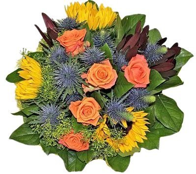 Celebrate the vibrant spirit of summer with the Tones of Summer Bouquet, a stunning floral arrangement featuring bold sunflowers, vivid orange roses, striking blue eryngium, deep red leucodendron, and lush salal greenery. This colorful summer flower bouquet captures the warmth, energy, and beauty of the season with a perfect mix of warm and cool tones.