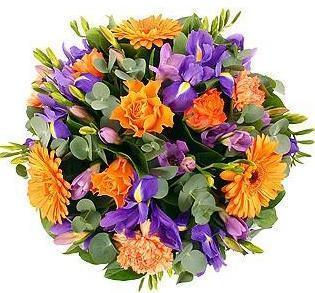 Complementing the orange and blue palette are the delicate purple freesias, adding a pop of color and a hint of fragrance to the arrangement. These blooms symbolize grace and thoughtfulness, enhancing the bouquet's overall charm and appeal. To add depth and texture, the Touch of Sky Bouquet is adorned with lush greenery, which provides a natural backdrop for the vibrant blooms and adds a touch of freshness to the arrangement.
