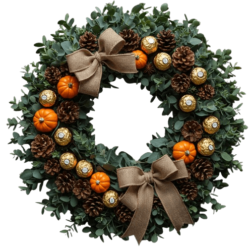 - Ferrero Rocher: wrapped in their signature golden foil. They bring a hint of luxury and sparkle, elevating the wreath with a subtle, festive shimmer that pairs beautifully with the natural elements.