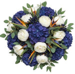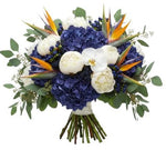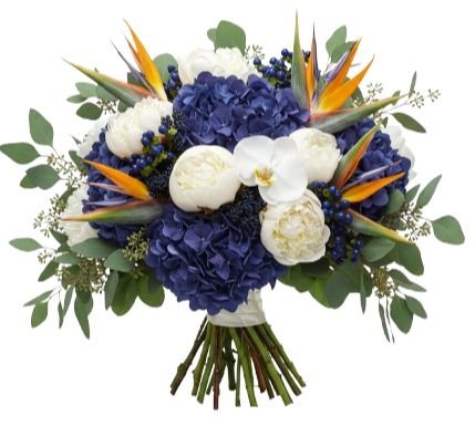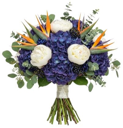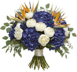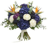 - Deep Purple/Blue Hydrangea: these voluminous blooms add depth and drama, with rich jewel tones that balance the fiery Birds of Paradise and soften the bouquet with lush texture.