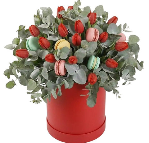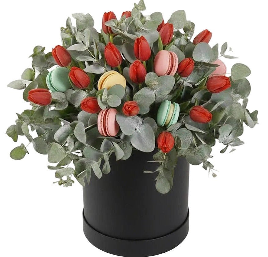 Tulips and Eucalyptus Spring Gift Box with Macarons is a refined seasonal gift combining fresh tulips, aromatic eucalyptus and delicate macarons. This elegant flower box brings together natural beauty and sweet indulgence, making it a perfect present for spring celebrations. Beautifully presented in a stylish gift box, this spring flower arrangement is perfect for special occasions, celebrations or thoughtful gestures. Ideal for birthdays, thank-you gifts, Mother’s Day, anniversaries, or spring celebrations, this stylish arrangement is designed to delight both the eyes and the taste buds. The soft beauty of tulips paired with the fresh scent of eucalyptus creates a sophisticated floral presentation, while the macarons add a luxurious finishing touch.