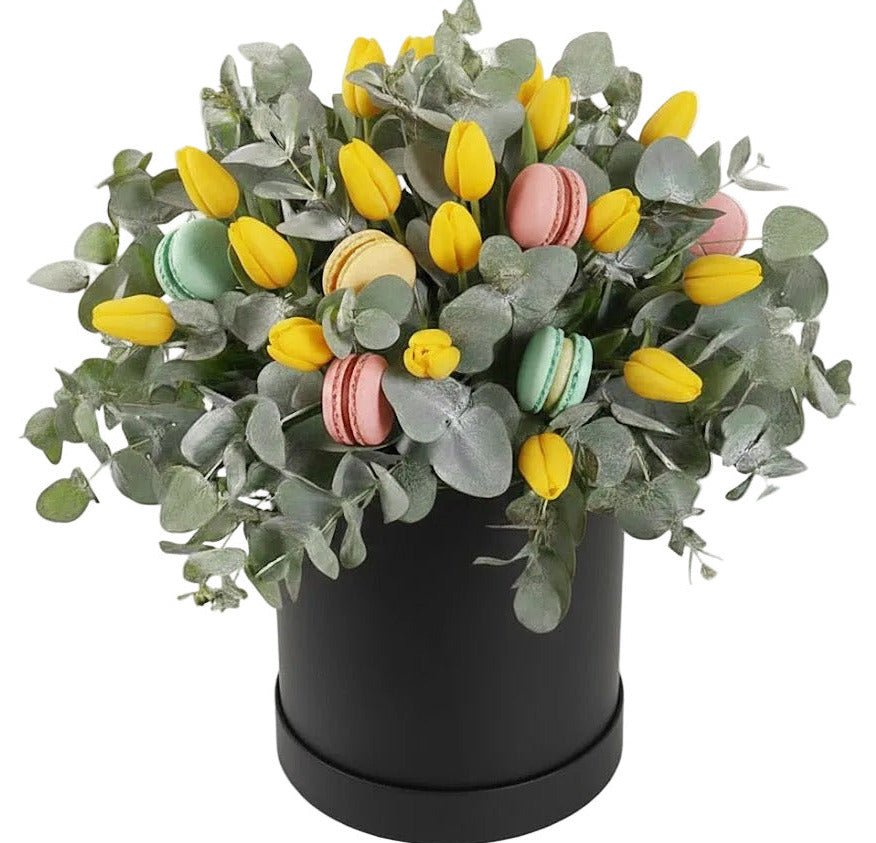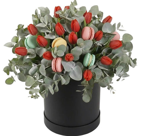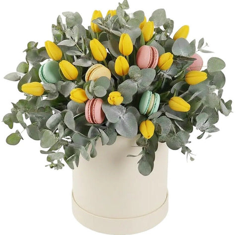 Tulips and Eucalyptus Flower Box with Macarons – Perfect Spring Gift