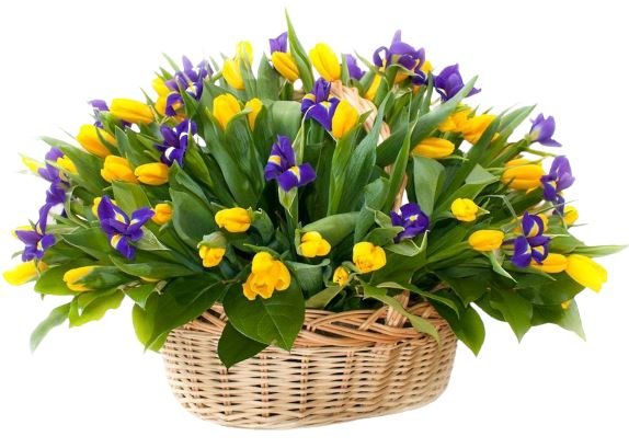 Tulips and Iris Basket – Elegant Floral Arrangement with Spring Blooms