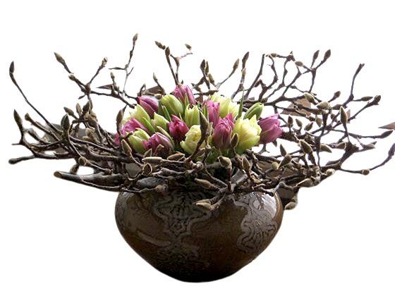 Order your Tulips in Magnolia Branches Pot Arrangement today for delivery across London and the UK.