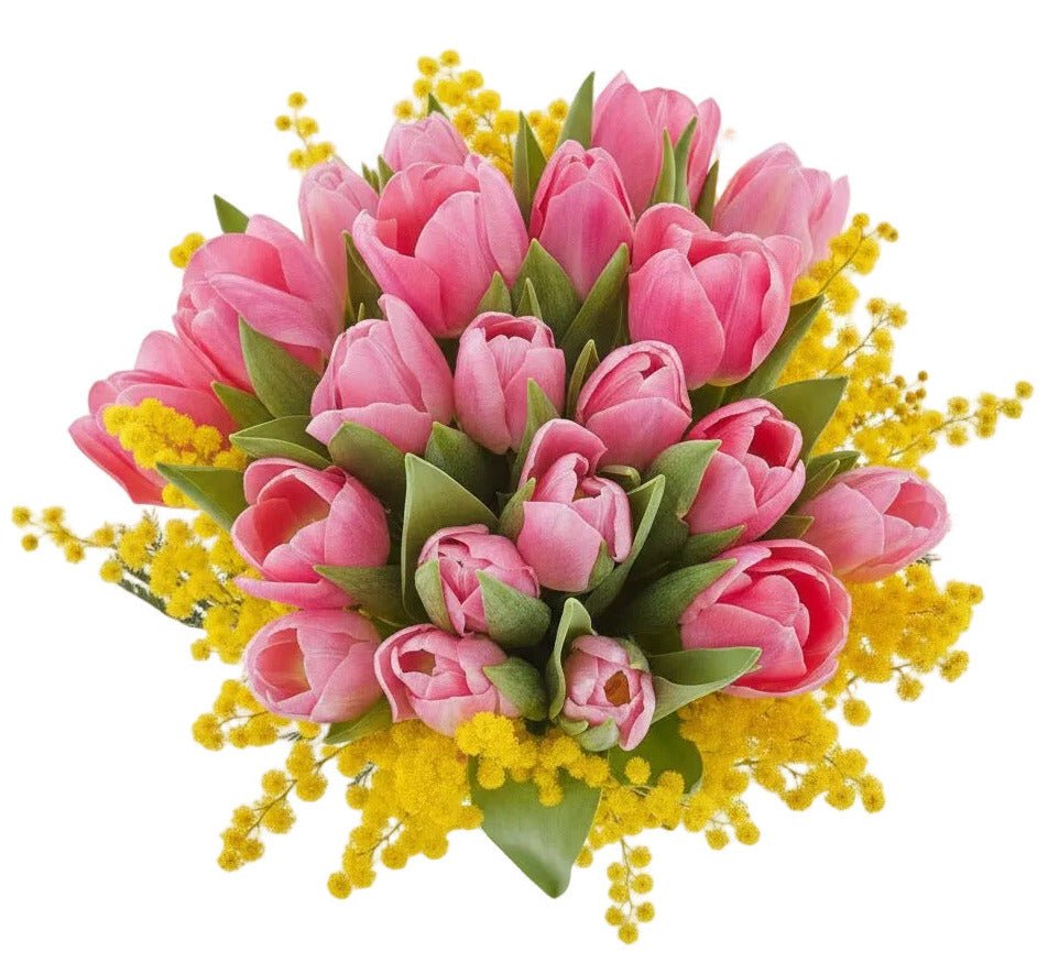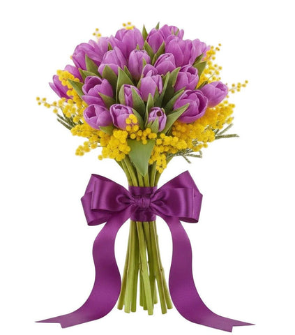 Our Tulips in Mimosa Splendid Bouquet is a radiant spring arrangement that combines the timeless elegance of tulips with the cheerful charm of yellow mimosa. You can select the tulip colour of your choice, allowing you to personalise the bouquet to suit the occasion or recipient. Paired with delicate, fluffy mimosa, this design creates a fresh, vibrant, and uplifting display. Perfect for birthdays, International Women’s Day, anniversaries, or simply to celebrate the arrival of spring, this bouquet symbolises happiness, appreciation, and warmth. The bright yellow mimosa adds texture and seasonal character, while the tulips bring classic beauty and versatility.