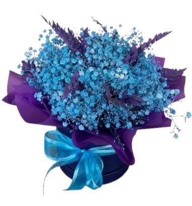 The Turquoise Gypsophila with Purple Leaves Box is perfect for those who love unique floral arrangements that stand out. Whether used as a decorative centerpiece, a stylish gift, or a statement floral piece, this stunning box is sure to captivate and impress.
