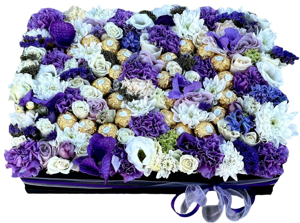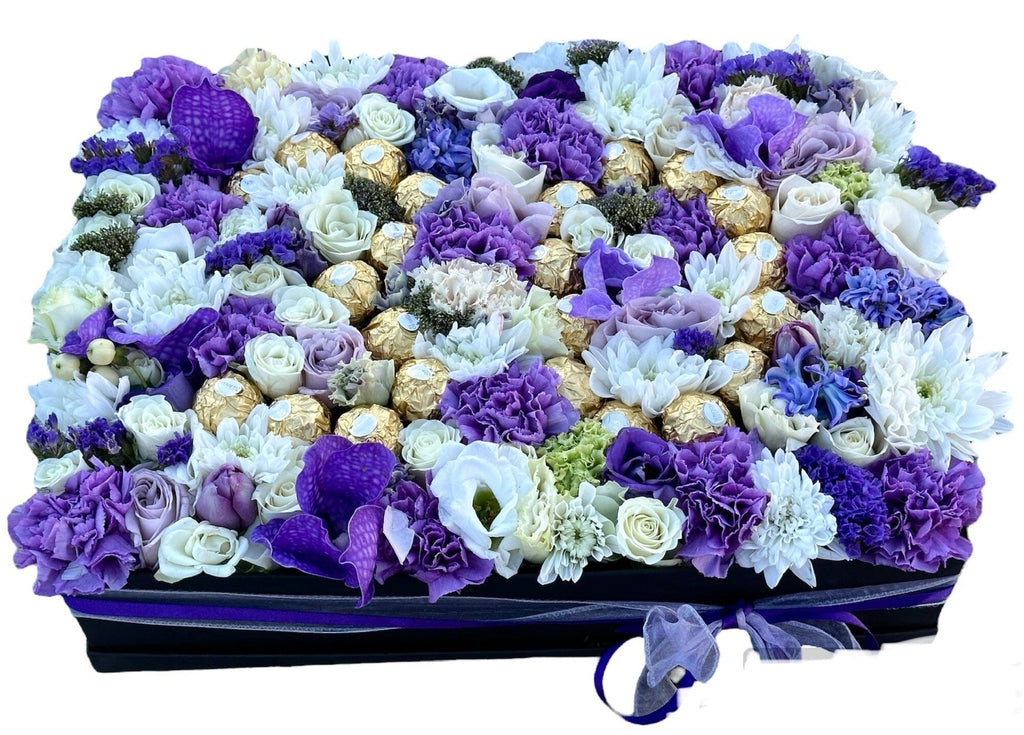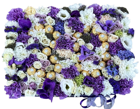 Carefully arranged in a chic flower box, this combination of fresh flowers and decadent chocolates is designed to create a lasting impression. The vibrant yet harmonious color palette of white, lavender, and purple blooms paired with indulgent chocolates makes this box a thoughtful and luxurious gift.