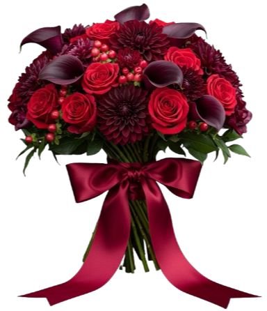 Each black calla lily symbolizes mystery and elegance, with velvety petals that exude opulence. The striking contrast of pristine red roses against the dark blooms creates a captivating visual harmony, reminiscent of a glamorous black-tie event beneath a moonlit sky. Whether you’re celebrating a special occasion or seeking to make a statement, the Velvet Nightfall Bouquet is perfect for weddings, anniversaries, or even a stylish Halloween celebration.