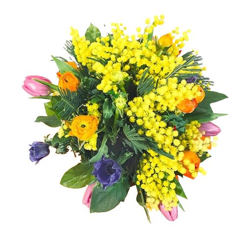The Vibrant Spring Flower with Mimosa Bouquet is a joyful celebration of spring, bursting with vivid colors and fresh floral beauty. Featuring a delightful combination of yellow mimosa, pink tulips, orange ranunculus, and blue anemone flowers, this bouquet captures the essence of a blooming spring garden, making it the perfect gift for any occasion that calls for happiness and vitality.